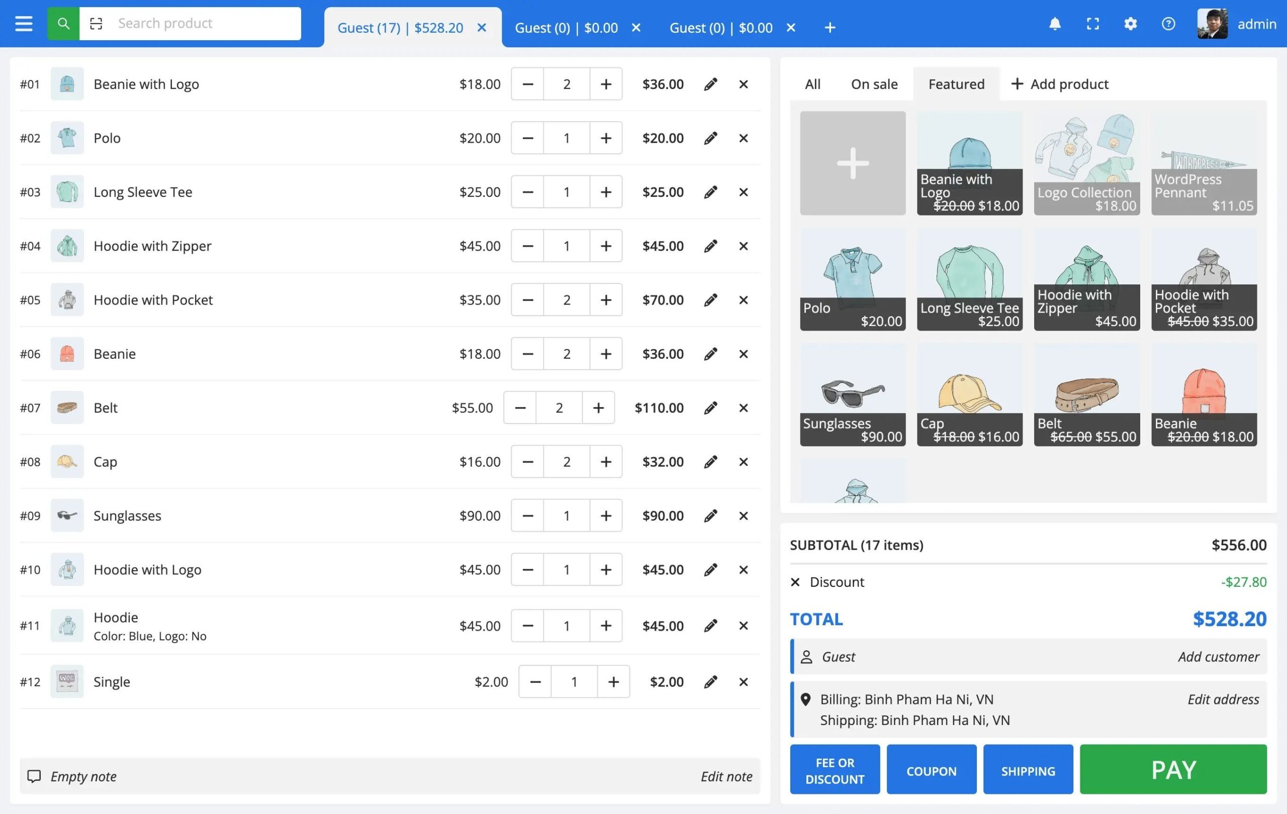 - Cho phép tìm kiếm theo tên sản phẩm, SKU, danh mục để thêm vào giỏ hàng nhanh hơn.